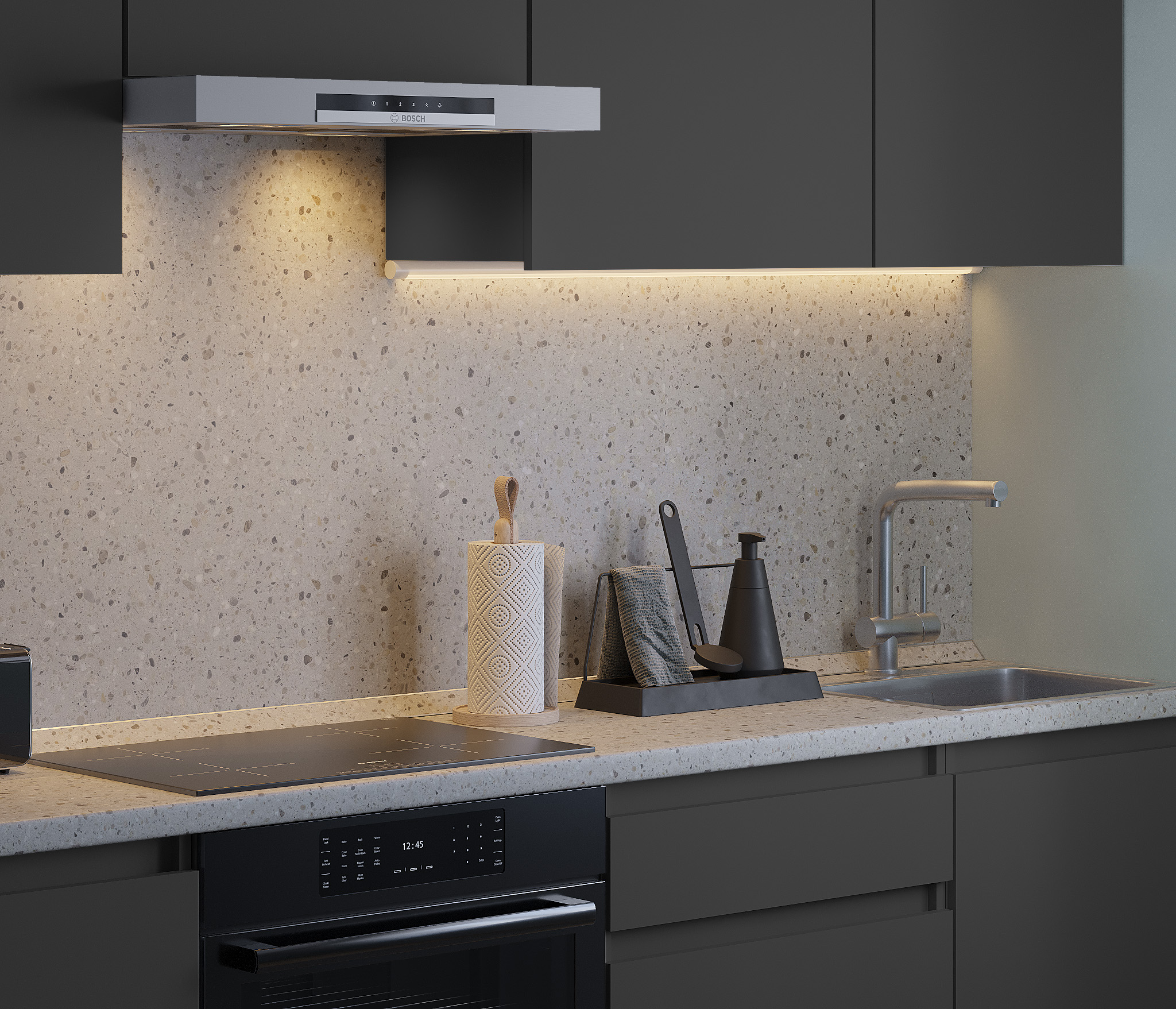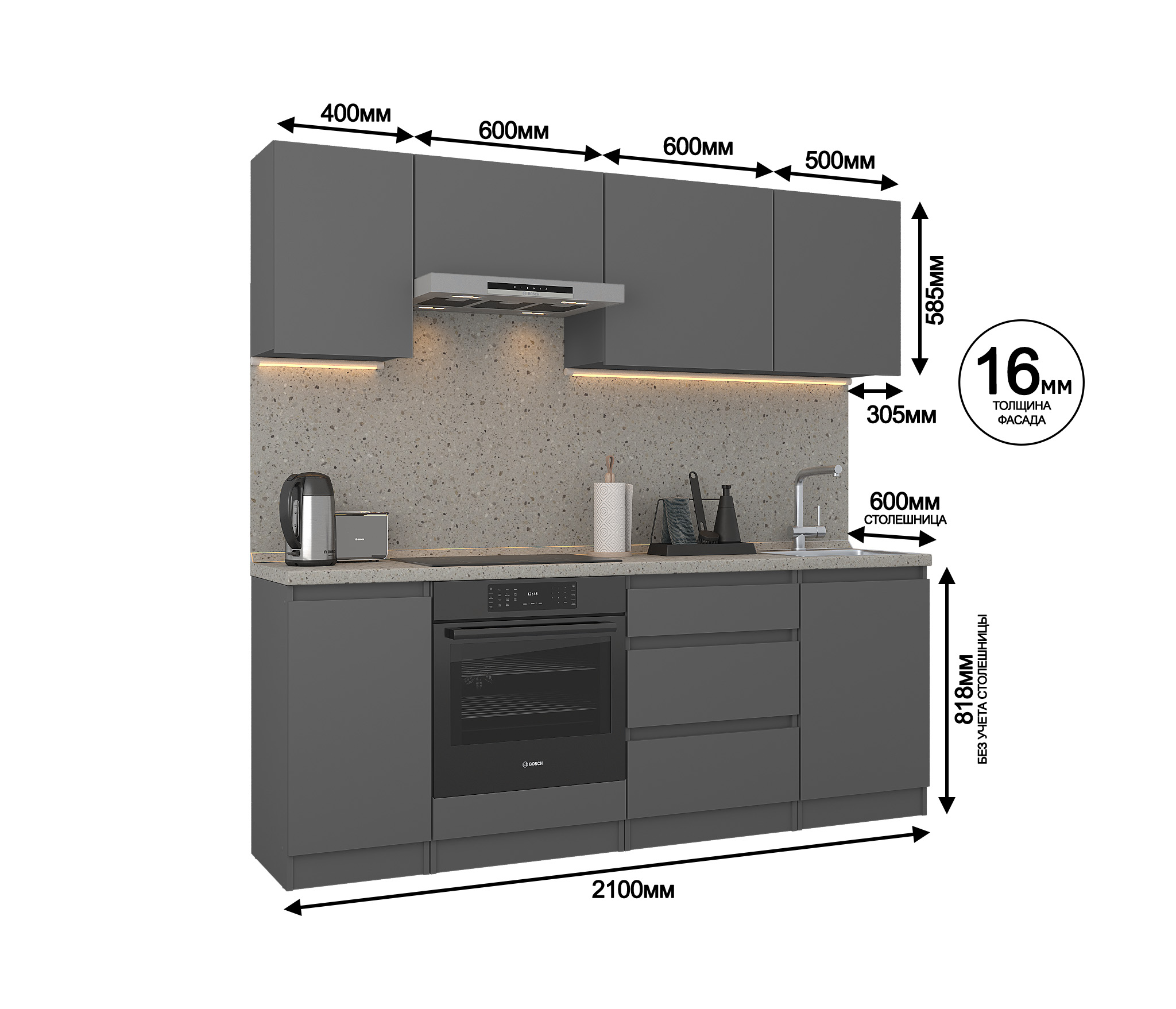 Обратите внимание, что столешница, стеновая панель, мойка и смеситель не входят в комплектацию кухни Леон и приобретаются отдельно. Это позволяет вам выбрать идеальные аксессуары и элементы для создания индивидуального дизайна вашей кухни.