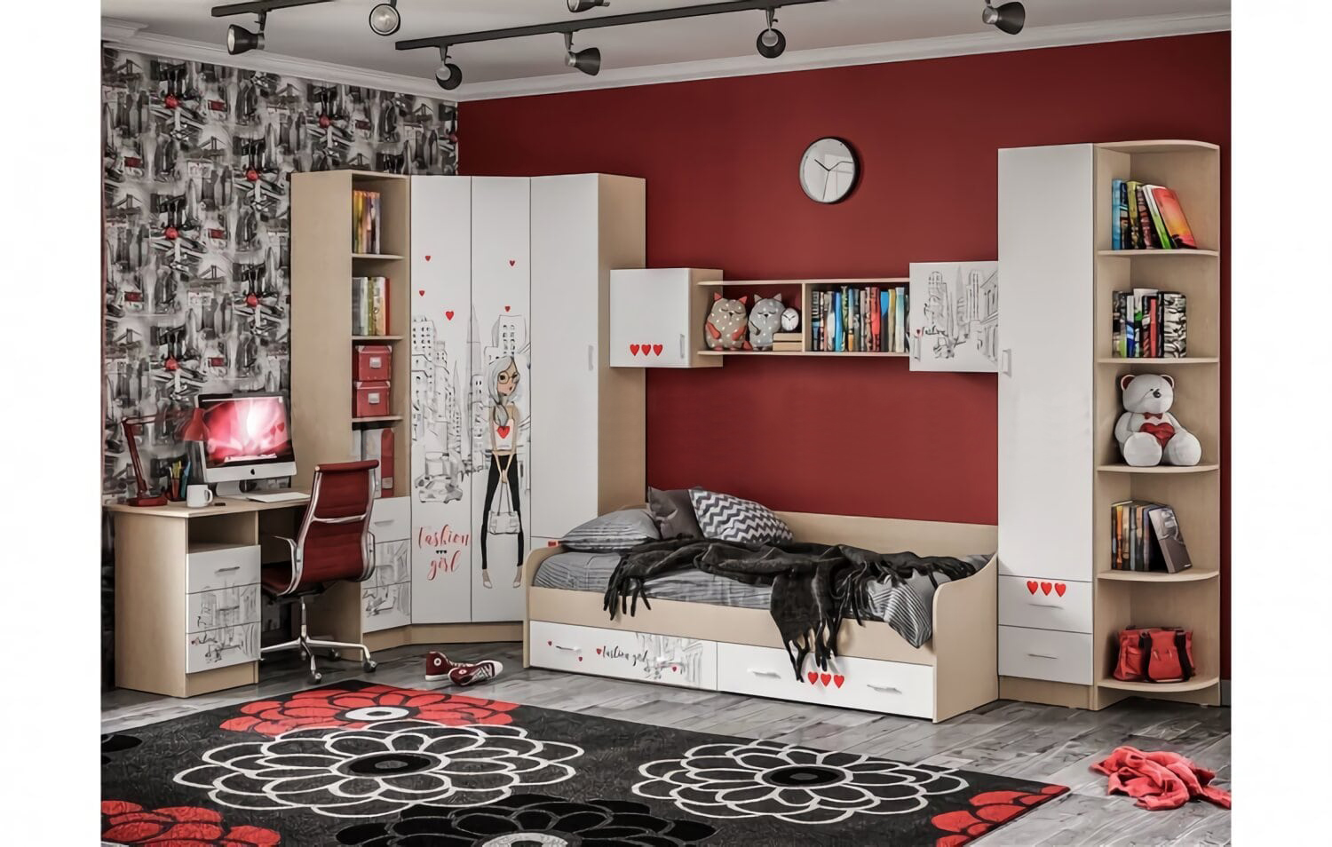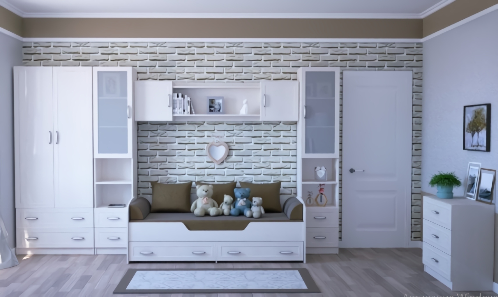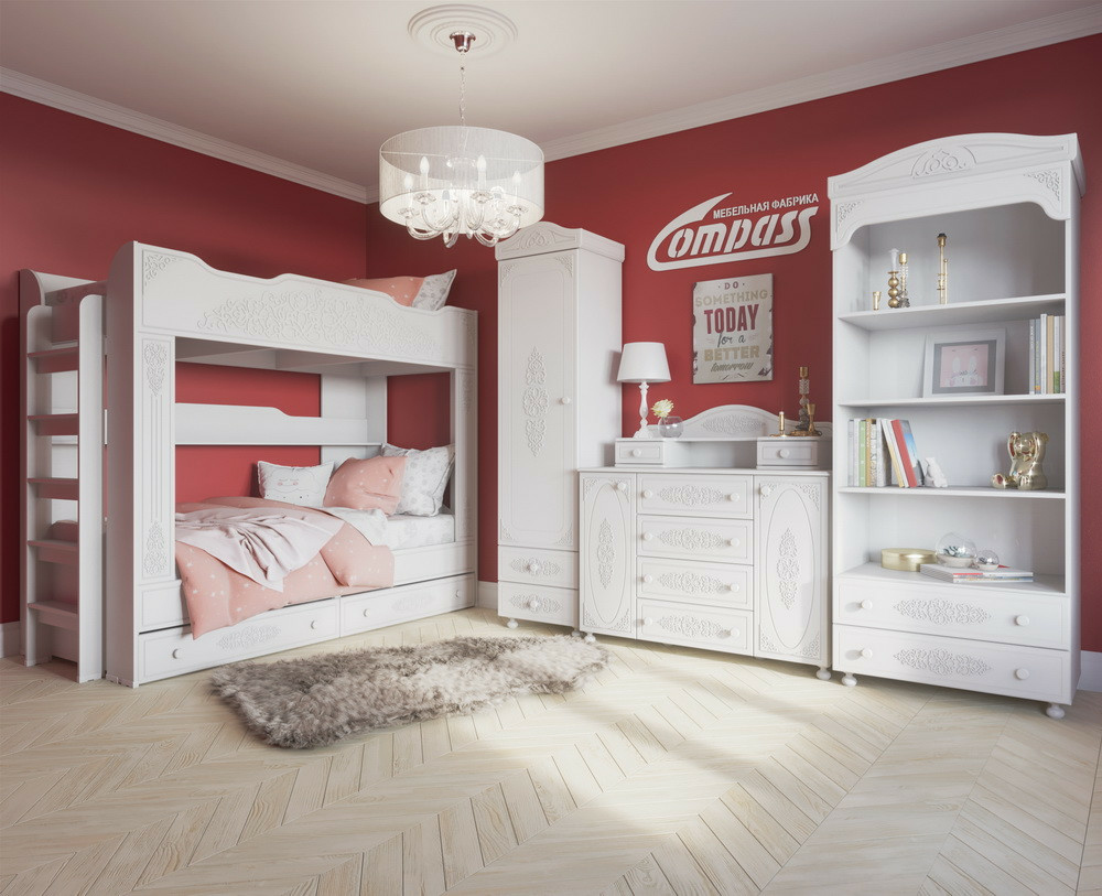 Комплект состоит из:Шкаф угловой Луиза (Размеры: 700x700, Н2040 мм), Шкаф трехдверный ШК-3 (Размеры:1150х516, Н2040 мм), Стол письменный Луиза СП-1 (Размеры: 1200х600, Н750 мм), Кровать-тахта 900 Луиза КР-2 (Размеры: 2044х932, Н800 мм), Комод Луиза (Размеры: 800х460, Н900 мм).