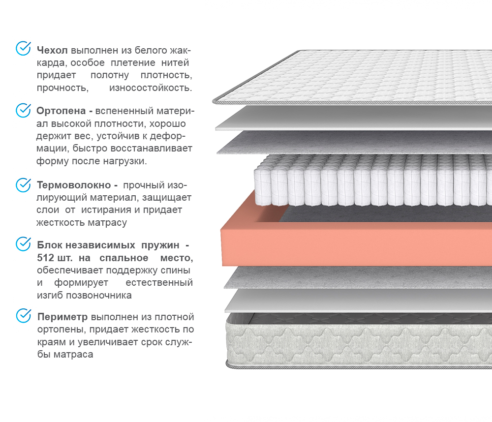 Термоволокно - изолирующий материал, отличается высокой степенью прочности, он защищает слои от истирания и придает дополнительную жесткость матрасу.