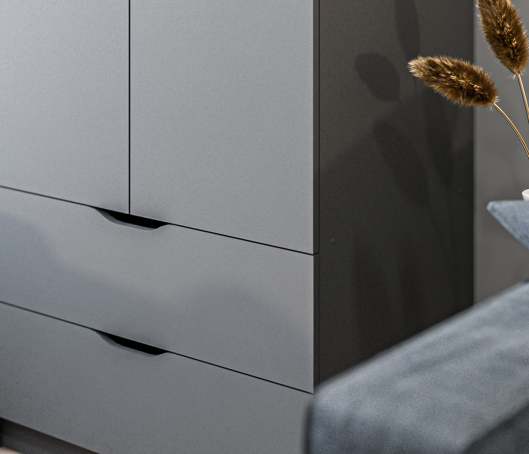 Дверцы шкафа не имеют ручек добавляют минималистичность в его дизайн.